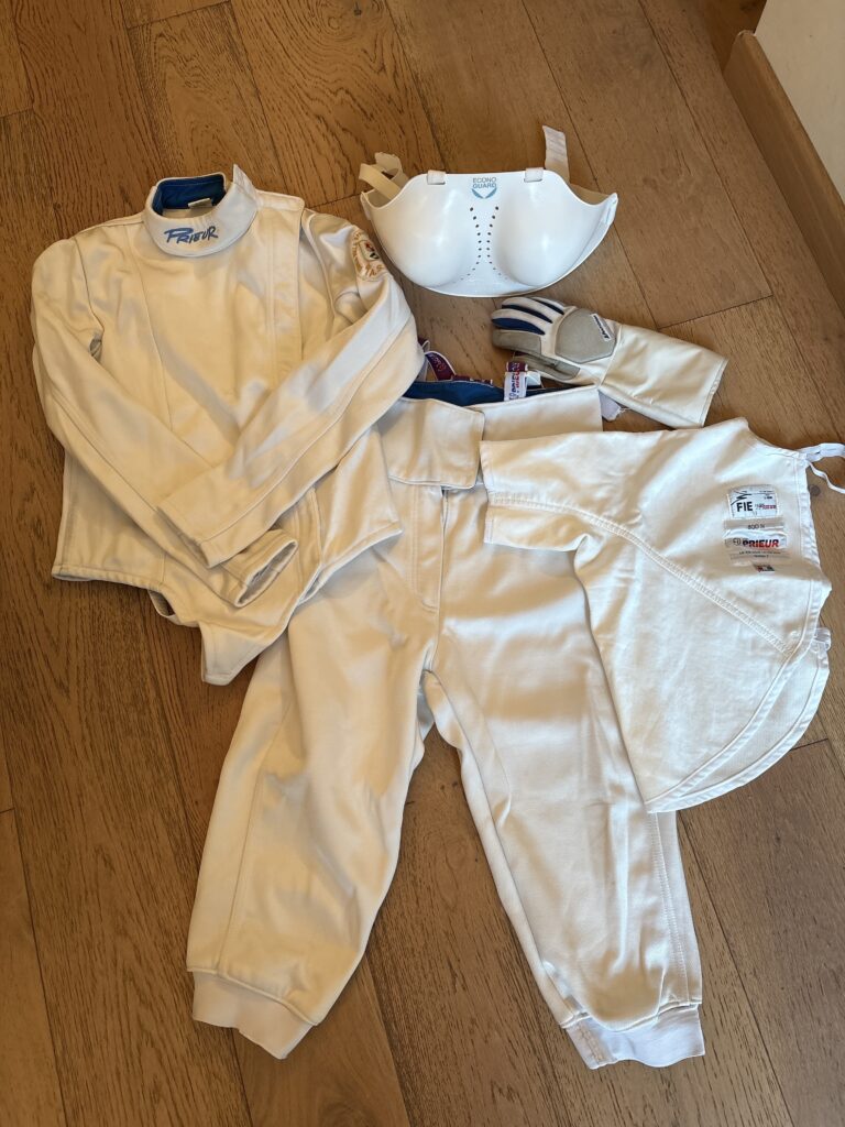 Ottime condizioni, usata pochissimo, vendo divisa completa scherma Prieur donna, dx, 800 N, taglia 38, composta da giacca + pantaloni + corazzetta taglia 1.2 e parapetto Econoguard taglia S. Guanto Viktoria taglia 8 in omaggio. Da ritirare a domicilio (Milano zona centro) o con spese di spedizione a carico dell’acquirente. Elisa