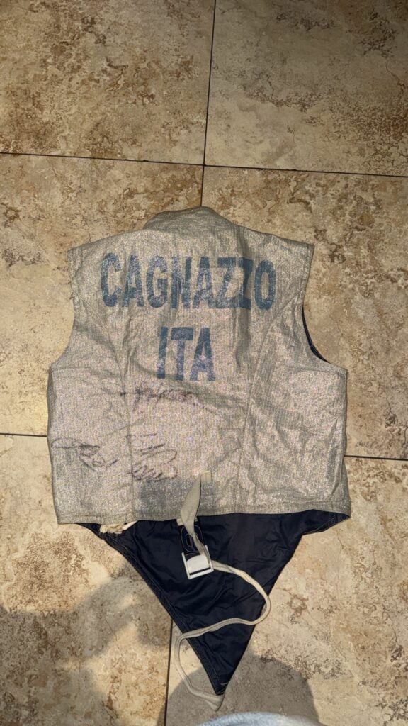 Giubbetto elettrico scherma, taglia 46, marca Eurofencing, uomo, usato, ottimo stato, scritta posteriore, firmato da Daniele Garozzo, Giorgio Avola e Andrea Cassarà.